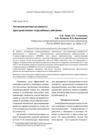 Библиографическое описание:Антиоксидантная активность пространственно-затруднённых анилинов = Antioxidant Activity of Sterically Hindered Anilines / Е. И. Лесик, Е. С. Семиченко, А. В. Лесничев, В. Д. Ворончихин. - Текст : непосредственный // Журнал Сибирского федерального университета. Химия. - 2010. - Т. 3, № 4. - С. 403-407. - Библиогр.: с. 406-407 (9 назв.). - ISSN 1998-2836.