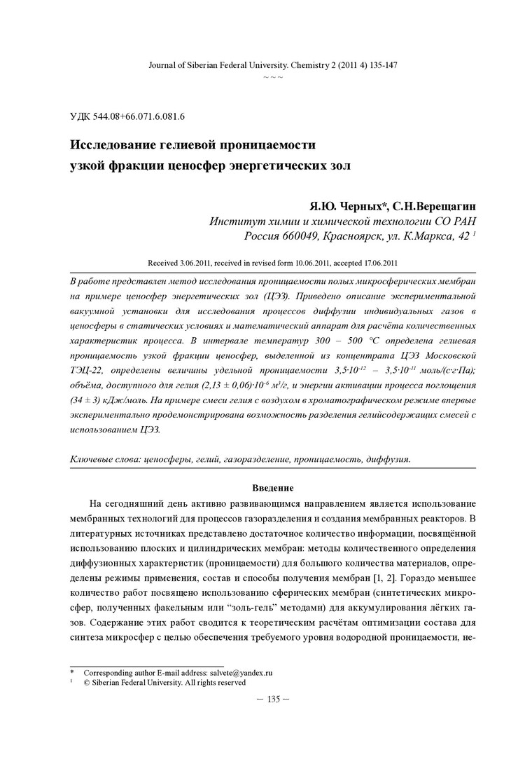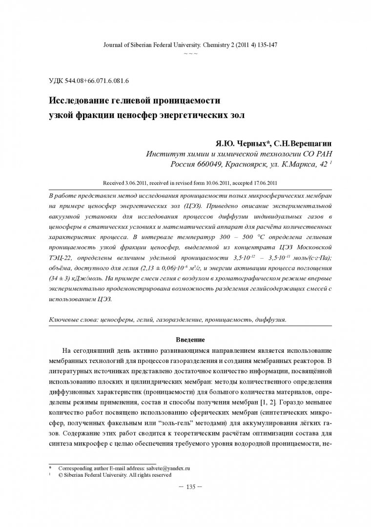 Библиографическое описание:Черных, Я. Ю. Исследование гелиевой проницаемости узкой фракции ценосфер энергетических зол = Helium Permeability Studies of Fly Ash Cenospheres / Я. Ю. Черных, С. Н. Верещагин. - Текст : непосредственный // Журнал Сибирского федерального университета. Химия. - 2011. - Т. 4, № 2. - С. 135-147. - Библиогр.: с. 145-146 (22 назв.). - ISSN 1998-2836.