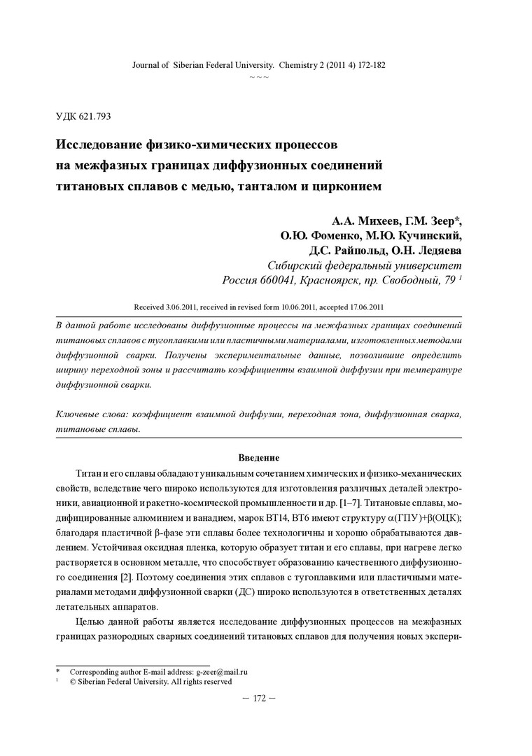 Библиографическое описание:Исследование физико-химических процессов на межфазных границах диффузионных соединений титановых сплавов с медью, танталом и цирконием = The Investigation of Physico-Chemical Processes at the Interfaces of Diffusion Joints of Titanium Alloys with Copper, Tantalum and Zirconium / А. А. Михеев, Г. М. Зеер, О. Ю. Фоменко [и др.]. - Текст : непосредственный // Журнал Сибирского федерального университета. Химия. - 2011. - Т. 4, № 2. - С. 172-182. - Библиогр.: с. 181-182 (13 назв.). - ISSN 1998-2836.