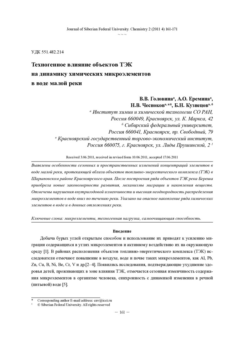 Библиографическое описание:Техногенное влияние объектов ТЭК на динамику химических микроэлементов в воде малой реки = Technogenic Impact of Fuel Energy Objects on Chemical Microelements Dynamics in Small River Water / В. В. Головина, А. О. Еремина, Н. В. Чесноков, Б. Н. Кузнецов. - Текст : непосредственный // Журнал Сибирского федерального университета. Химия. - 2011. - Т. 4, № 2. - С. 161-171. - Библиогр.: с. 169-170 (11 назв.). - ISSN 1998-2836.
