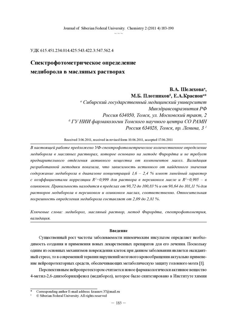 Библиографическое описание:Шелехова, В. А. Спектрофотометрическое определение медиборола в масляных растворах = Spectrophotometric Determination of Mediborol in its Oil Solutions / В. А. Шелехова, М. Б. Плотников, Е. А. Краснов. - Текст : непосредственный // Журнал Сибирского федерального университета. Химия. - 2011. - Т. 4, № 2. - С. 183-190. - Библиогр.: с. 189 (11 назв.). - ISSN 1998-2836.