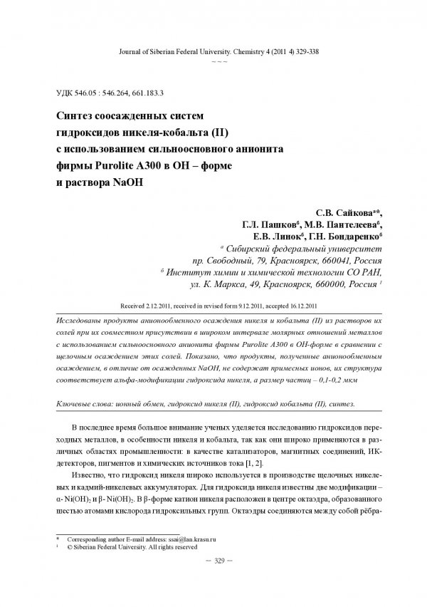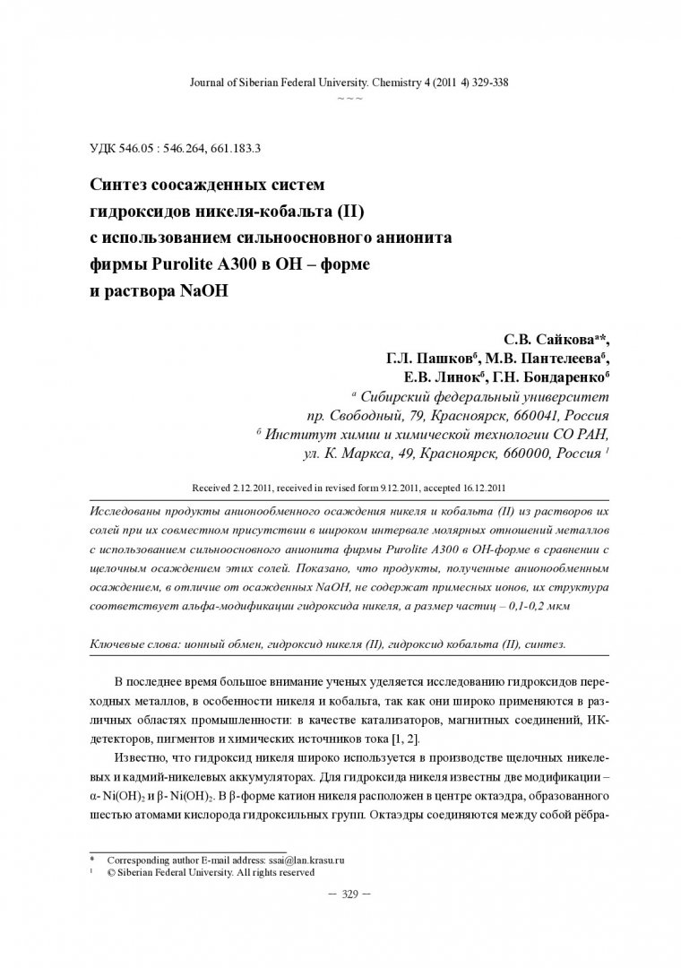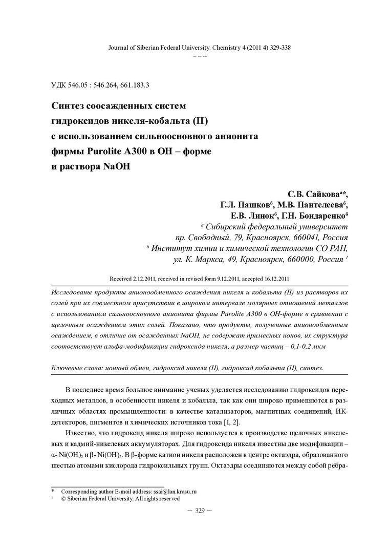 Библиографическое описание:Синтез соосажденных систем гидроксидов никеля-кобальта (II) с использованием сильноосновного анионита фирмы Purolite А300 в ОН - форме и раствора NaOH = Coprecipitation Synthesis of Nickel and Cobalt Hydroxides by Use Strong Based Anion Resin A300 in ОH - Form and NaOH Solution / С. В. Сайкова, Г. Л. Пашков, М. В. Пантелеева [и др.]. - Текст : непосредственный // Журнал Сибирского федерального университета. Химия. - 2011. - Т. 4, № 4. - С. 329-338. - Библиогр.: с. 337-338 (20 назв.). - ISSN 1998-2836.