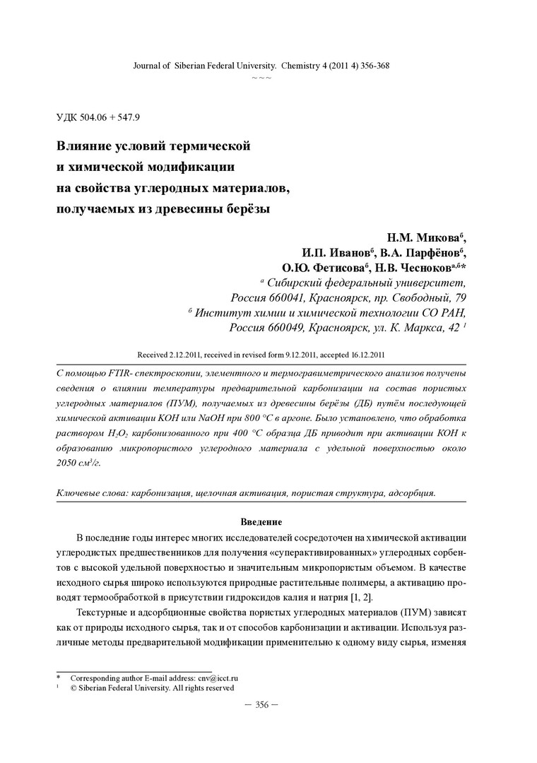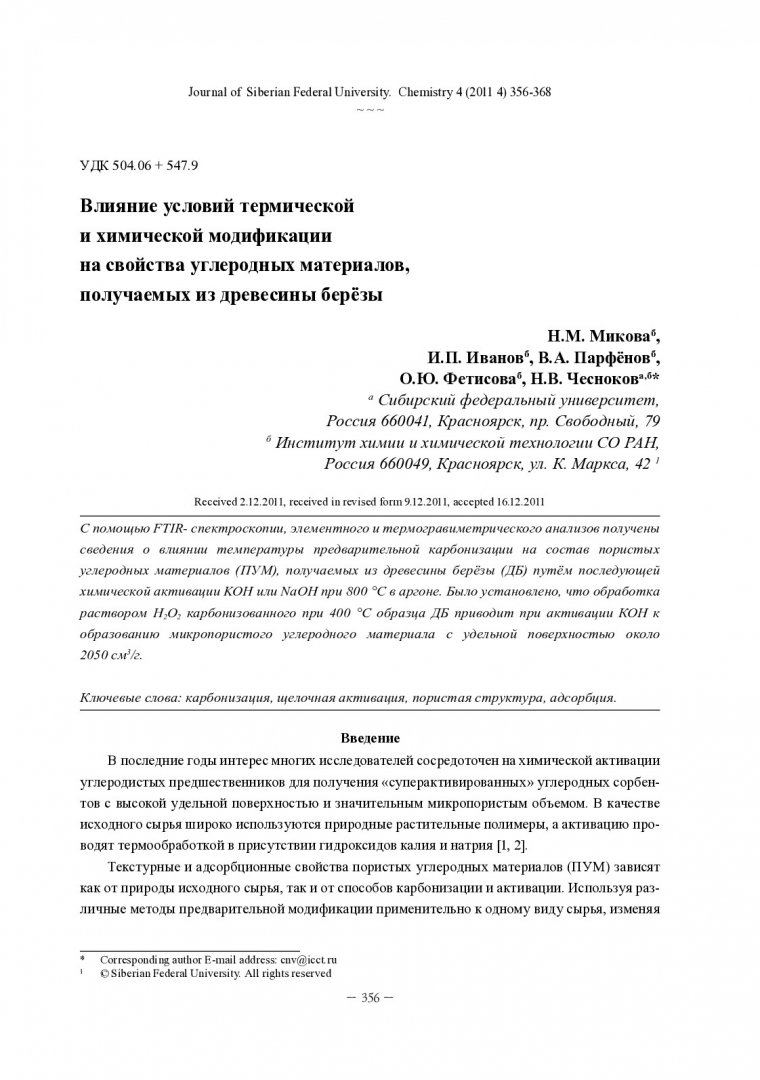 Библиографическое описание:Влияние условий термической и химической модификации на свойства углеродных материалов, получаемых из древесины берёзы = Effect of Thermal and Chemical Modification Conditions on Properties Carbon Materials Obtained from Birch Wood / Н. М. Микова, И. П. Иванов, В. А. Парфёнов [и др.]. - Текст : непосредственный // Журнал Сибирского федерального университета. Химия. - 2011. - Т. 4, № 4. - С. 356-368. - Библиогр.: с. 367-368 (16 назв.). - ISSN 1998-2836.