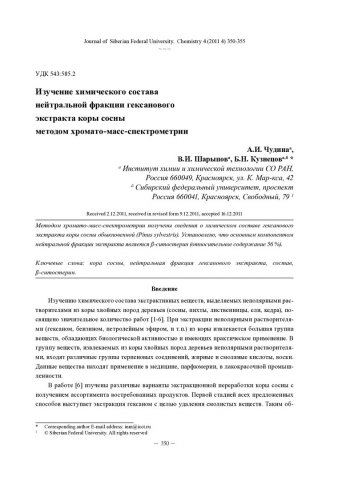 Библиографическое описание:Чудина, А. И. Изучение химического состава нейтральной фракции гексанового экстракта коры сосны методом хромато-масс-спектрометрии = Study of Chemical Composition of Neutral Fraction of Pine Bark Hexane Extract by Chromatography-Mass-Spectrometry Method / А. И. Чудина, В. И. Шарыпов, Б. Н. Кузнецов. - Текст : непосредственный // Журнал Сибирского федерального университета. Химия. - 2011. - Т. 4, № 4. - С. 350-355. - Библиогр.: с. 354-355 (16 назв.). - ISSN 1998-2836.