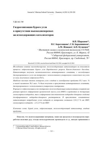 Библиографическое описание:Гидрогенизация бурого угля в присутствии высокодисперсных железосодержащих катализаторов = Hydrogenation of Brown Coal n the Presence of Highly Dispersed Iron-containing catalysts / В. И. Шарыпов, Н. Г. Береговцова, С. В. Барышников [и др.]. - Текст : непосредственный // Журнал Сибирского федерального университета. Химия. - 2011. - Т. 4, № 4. - С. 319-328. - Библиогр.: с. 326-328 (26 назв.). - ISSN 1998-2836.
