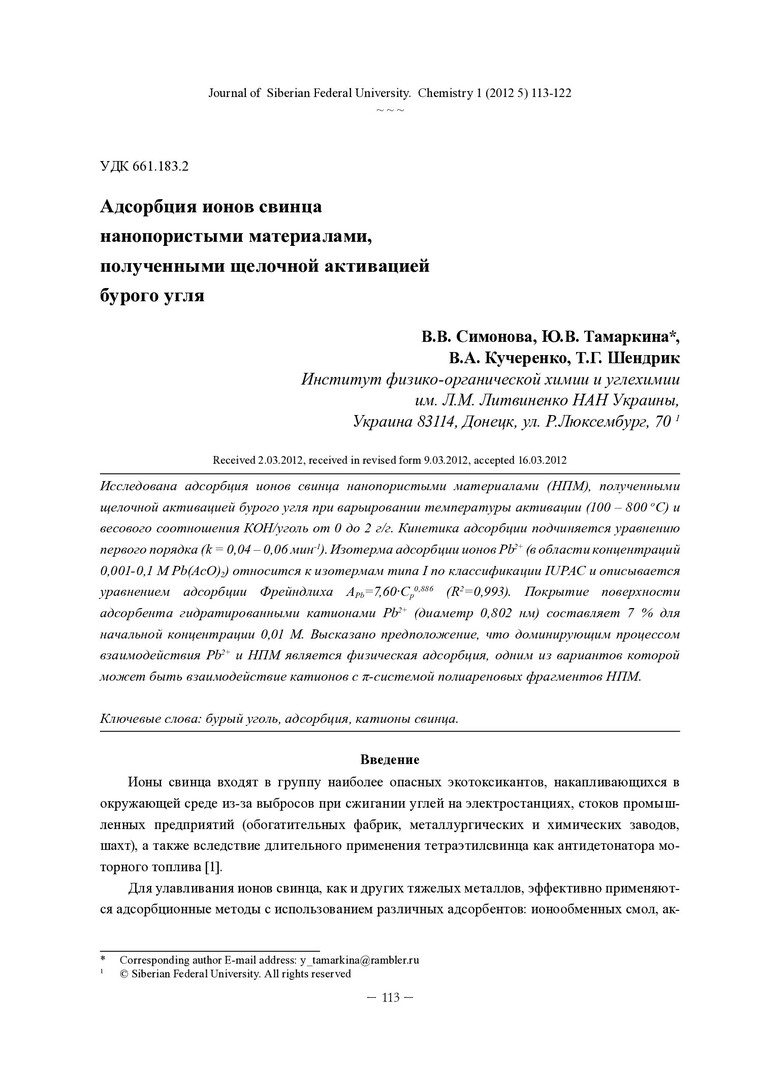 Библиографическое описание:Адсорбция ионов свинца нанопористыми материалами, полученными щелочной активацией бурого угля = Adsorption of Lead Ions by Nanoporous Materials, Prepared by Brown Coal Alkali Activation / В. В. Симонова [и др.]. - Текст : непосредственный // Журнал Сибирского федерального университета. Химия. - 2012. - Т. 5, № 1. - С. 113-122 : ил. - Библиогр.: с. 120-122 (29 назв.). - ISSN 1998-2836.