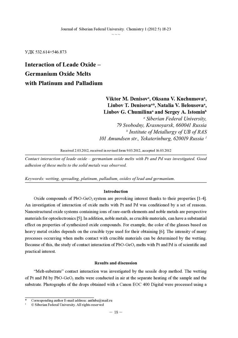 Библиографическое описание:Interaction of Leade Oxide - Germanium Oxide Melts with Platinum and Palladium = Взаимодействие расплавов оксидов свинца - оксидов германия с платиной и палладием / V. M. Denisov [et al.]. - Текст : непосредственный // Журнал Сибирского федерального университета. Химия. - 2012. - Т. 5, № 1. - С. 18-23 : ил. - Библиогр.: с. 22-23 (22 назв.). - ISSN 1998-2836.