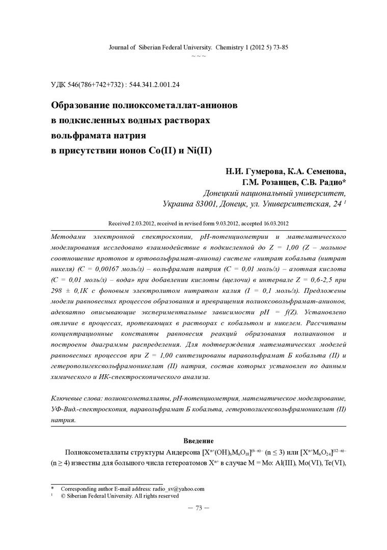 Аннотация:Методами электронной спектроскопии, pH- потенциометрии и математического моделирования исследовано взаимодействие в подкисленной до Z = 1, 00 (Z - мольное соотношение протонов и ортовольфрамат-аниона) системе "нитрат кобальта (нитрат никеля) (С = 0, 00167 моль/л) - вольфрамат натрия (С = 0, 01 моль/л) - азотная кислота (С = 0, 01 моль/л) - вода" при добавлении кислоты (щелочи) в интервале Z - 0, 6-2, 5 при 298 ± 0, 1К с фоновым электролитом нитратом калия (I =0, 1 моль/л). Предложены модели равновесных процессов образования и превращения полиоксовольфрамат-анионов, адекватно описывающие экспериментальные зависимости pH = f (Z) /.
