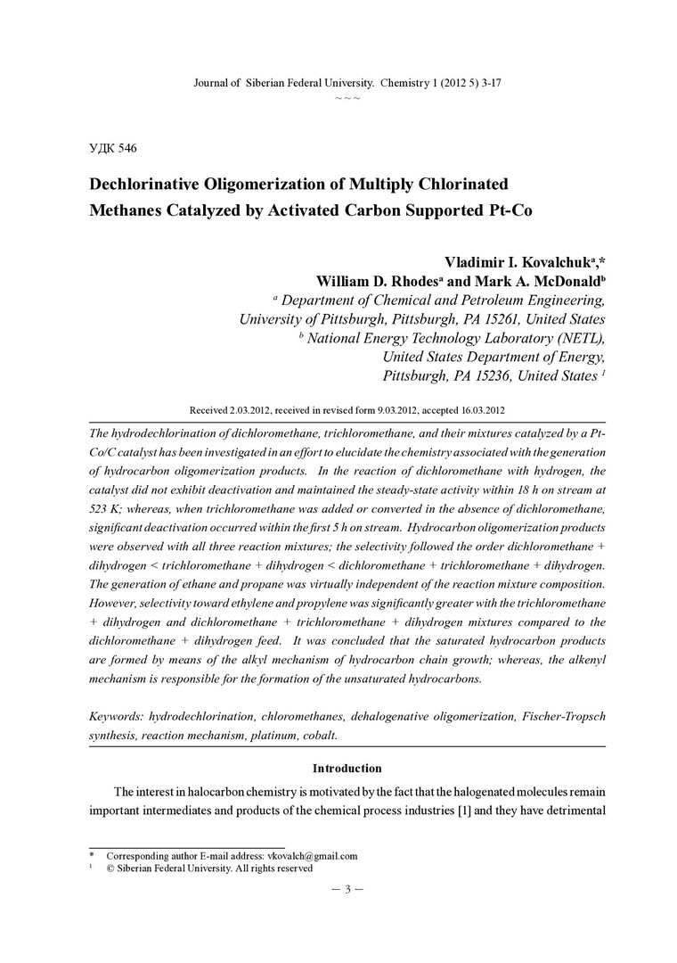 Библиографическое описание: Kovalchuk, Vladimir. Dechlorinative Oligomerization of Multiply Chlorinated Methanes Catalyzed by Activated Carbon Supported Pt-Co = Олигомеризация полихлорированных метанов в С[2+] углеводороды в присутствии Pt-Co/C катализаторов / V. I. Kovalchuk, W. D. Rhodes, M. A. McDonald. - Текст : непосредственный // Журнал Сибирского федерального университета. Химия. - 2012. - Т. 5, № 1. - С. 3-17 : ил. - Библиогр.: с. 13-17 (59 назв.). - ISSN 1998-2836.