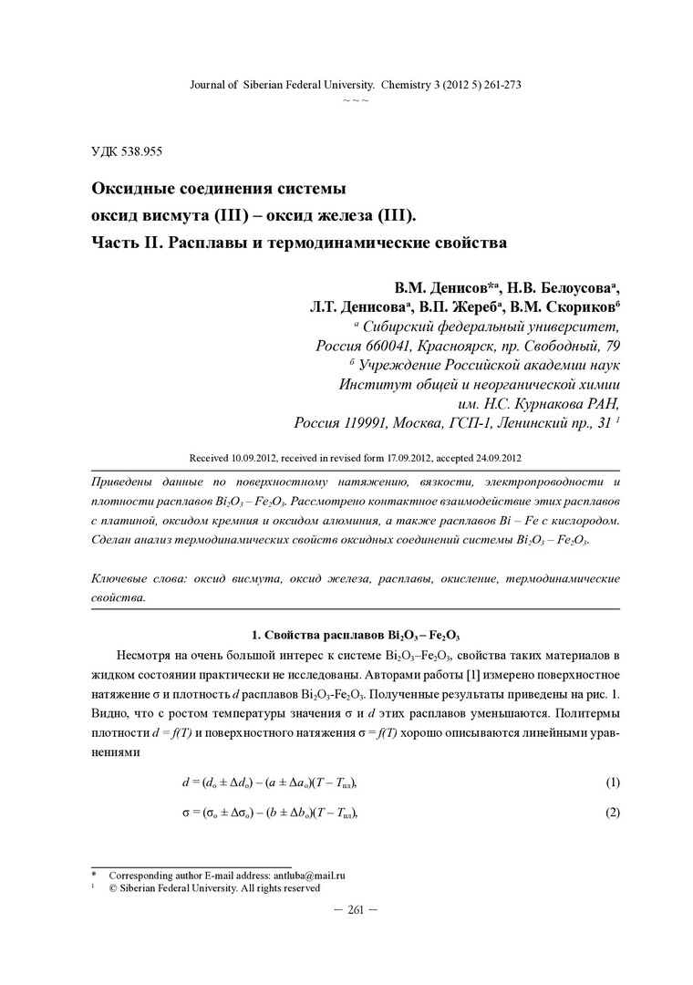 Библиографическое описание:Оксидные соединения системы оксид висмута (III) – оксид железа (III). = Oxide Compounds of Bi2O3 – Fe2O3 System. P. II Melts and Thermodynamic Properties. Ч. II. Расплавы и термодинамические свойства / Денисов В. М. [и др.]. - Текст : непосредственный // Журнал Сибирского федерального университета. Химия. - 2012. - Т. 5, № 3. - С. 261-273. - Библиогр.: с. 271-272. - ISSN 1998-2836.