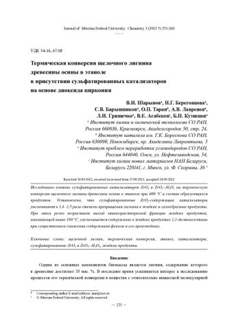 Аннотация:Исследовано влияние сульфатированных катализаторов на термическую конверсию щелочного лигнина древесины осины в этаноле при 400 °С и состав образующихся продуктов. Установлено, что сульфатированные -содержащие катализаторы увеличивают в 1, 4–1, 5 раза степень превращения лигнина в жидкие и газообразные продукты. При этом резко возрастает выход этанолрастворимой фракции жидких продуктов, выкипающей выше 180 °С, увеличивается содержание в жидких продуктах 1, 1-диэтоксиэтана при существенном снижении содержания фенола и его производных.