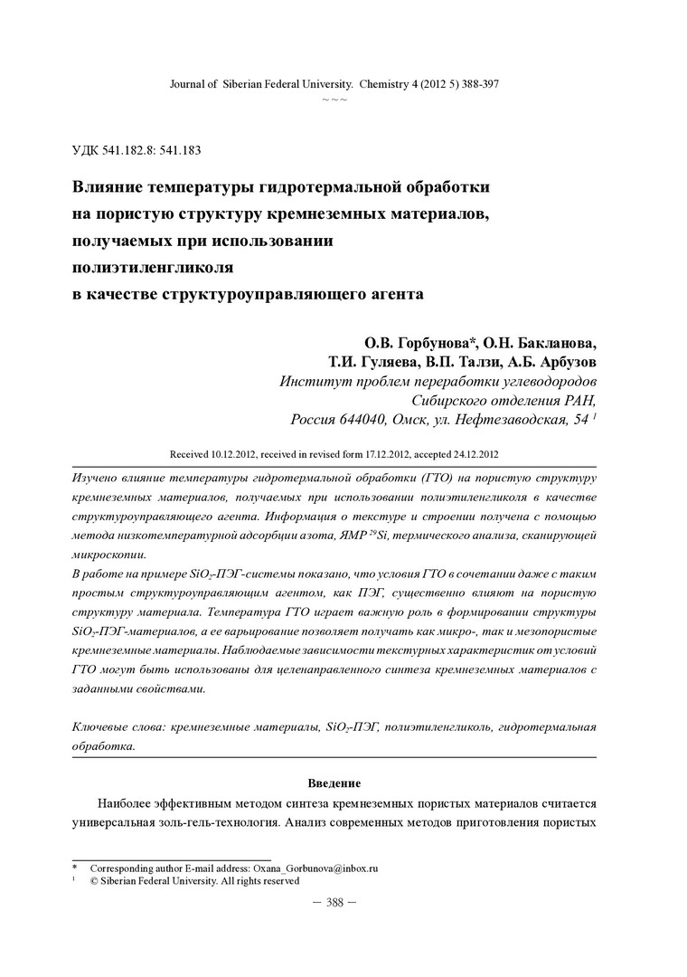 Библиографическое описание:Влияние температуры гидротермальной обработки на пористую структуру кремнеземных материалов, получаемых при использовании полиэтиленгликоля в качестве структуроуправляющего агента = The Effect of Hydrothermal Treatment Temperature on Porous Structure of Silica Materials Obtained with Polyethylene Glycol as Structure-Direct Agent / О. В. Горбунова [и др.]. - Текст : непосредственный // Журнал Сибирского федерального университета. Химия. - 2012. - Т. 5, № 4. - С. 388-397 : ил. - Библиогр.: с. 395-396 (22 назв.). - ISSN 1998-2836.