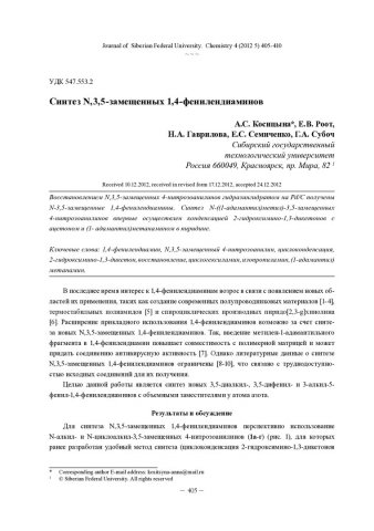 Библиографическое описание:Синтез N,3,5-замещенных 1,4-фенилендиаминов = Synthesis of N,3,5-Substituted 1,4-Phenylenediamines / А. С. Косицына [и др.]. - Текст : непосредственный // Журнал Сибирского федерального университета. Химия. - 2012. - Т. 5, № 4. - С. 405-410 : ил. - Библиогр.: с. 410 (12 назв.). - ISSN 1998-2836.