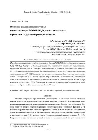 Библиографическое описание:Влияние содержания платины в катализаторе Pt/MOR/Al[2]O[3] на его активность в реакции гидроизомеризации бензола = The Effect of the Platinum Content on Pt/MOR/Al[2]O[3] Activity in Benzene Hydroisomerization / У. А. Белопухов [и др.]. - Текст : непосредственный // Журнал Сибирского федерального университета. Химия. - 2012. - Т. 5, № 4. - С. 398-404 : ил. - Библиогр.: с. 403-404 (8 назв.). - ISSN 1998-2836.
