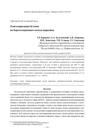 Библиографическое описание:Олигомеризация бутенов на боратсодержащем оксиде циркония = Butenes Oligomerization on Borated Zirconia / Т. Р. Карпова [и др.]. - Текст : непосредственный // Журнал Сибирского федерального университета. Химия. - 2012. - Т. 5, № 4. - С. 376-387 : ил. - Библиогр.: с. 385-387 (26 назв.). - ISSN 1998-2836.