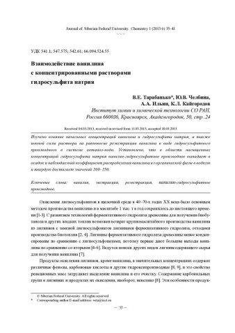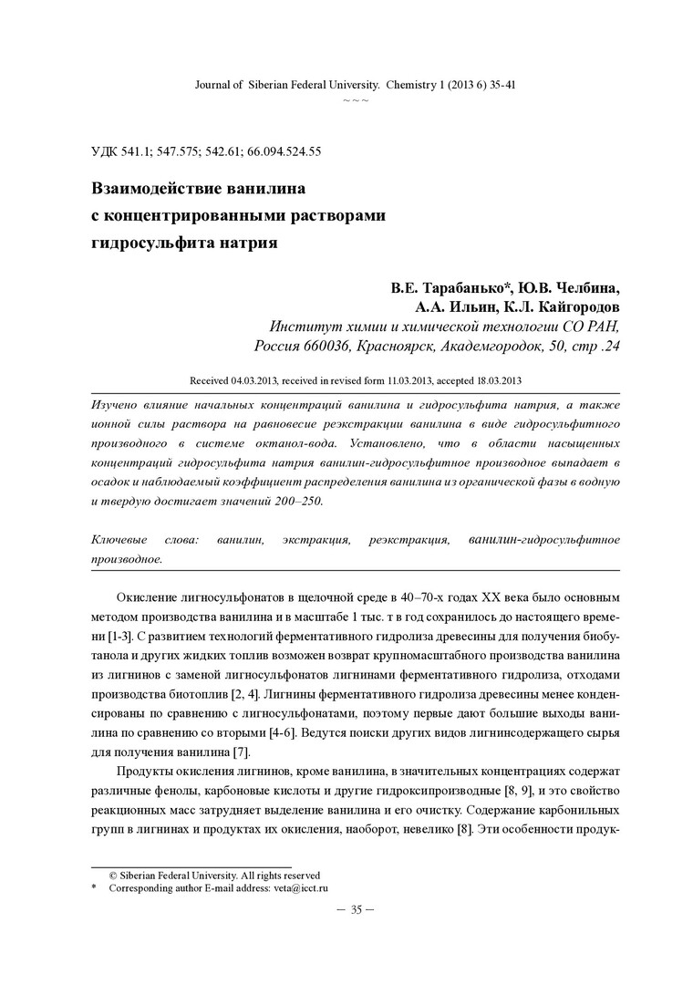 Библиографическое описание:Взаимодействие ванилина с концентрированными растворами гидросульфита натрия = Interaction of Vanillin with Concentrated Sodium Hydrosulfite Solution / В. Е. Тарабанько [и др.]. - Текст : непосредственный // Журнал Сибирского федерального университета. Химия. - 2013. - Т. 6, № 1. - С. 35-41 : ил. - Библиогр.: с. 40-41 (19 назв.). - ISSN 1998-2836.