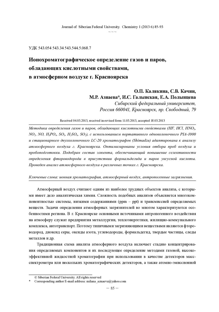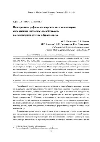 Библиографическое описание:Ионохроматографическое определение газов и паров, обладающих кислотными свойствами, в атмосферном воздухе г. Красноярска = Determination of Gases and Vapors with Acidic Properties by Ion Chromatography in the Air of Krasnoyarsk / О. П. Калякина [и др.]. - Текст : непосредственный // Журнал Сибирского федерального университета. Химия. - 2013. - Т. 6, № 1. - С. 85-93 : ил. - Библиогр.: с. 92 (8 назв.). - ISSN 1998-2836.