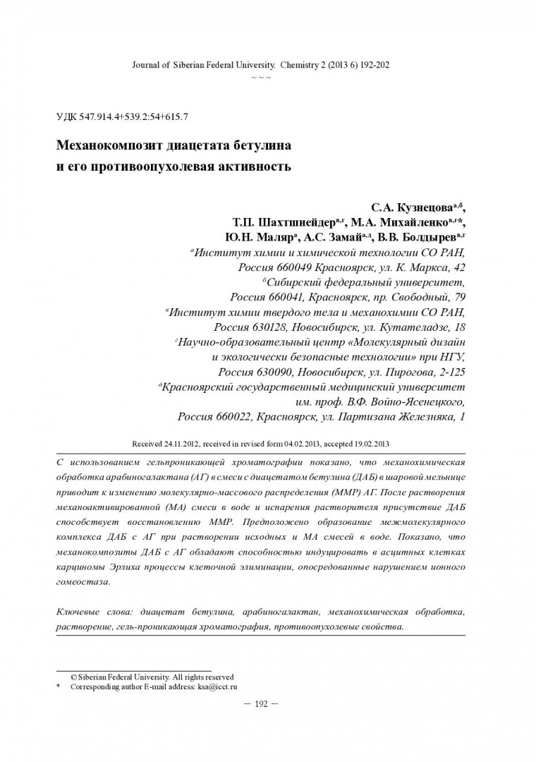 Библиографическое описание:Механокомпозит диацетата бетулина и его противоопухолевая активность = The mechanocomposite of betulin diacetate and its Antitumor Activity / С. А. Кузнецова [и др.]. - Текст : непосредственный // Журнал Сибирского федерального университета. Химия. - 2013. - Т. 6, № 2. - С. 192-202 : ил. - Библиогр.: с. 200-201 (21 назв.). - ISSN 1998-2836.
