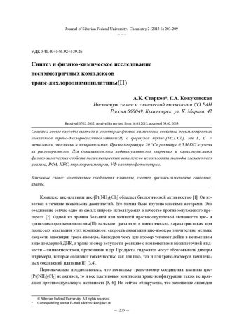 Библиографическое описание:Старков, А. К. Синтез и физико-химическое исследование несимметричных комплексов транс-дихлородиаминплатины(II) = The Synthesis and Physico-Chemical Studies of Nonsymmetric Complexes Trans-Dichlorodiaminplatinum(II) / А. К. Старков, Г. А. Кожуховская. - Текст : непосредственный // Журнал Сибирского федерального университета. Химия. - 2013. - Т. 6, № 2. - С. 203-209 : ил. - Библиогр.: с. 208-208 (14 назв.). - ISSN 1998-2836.