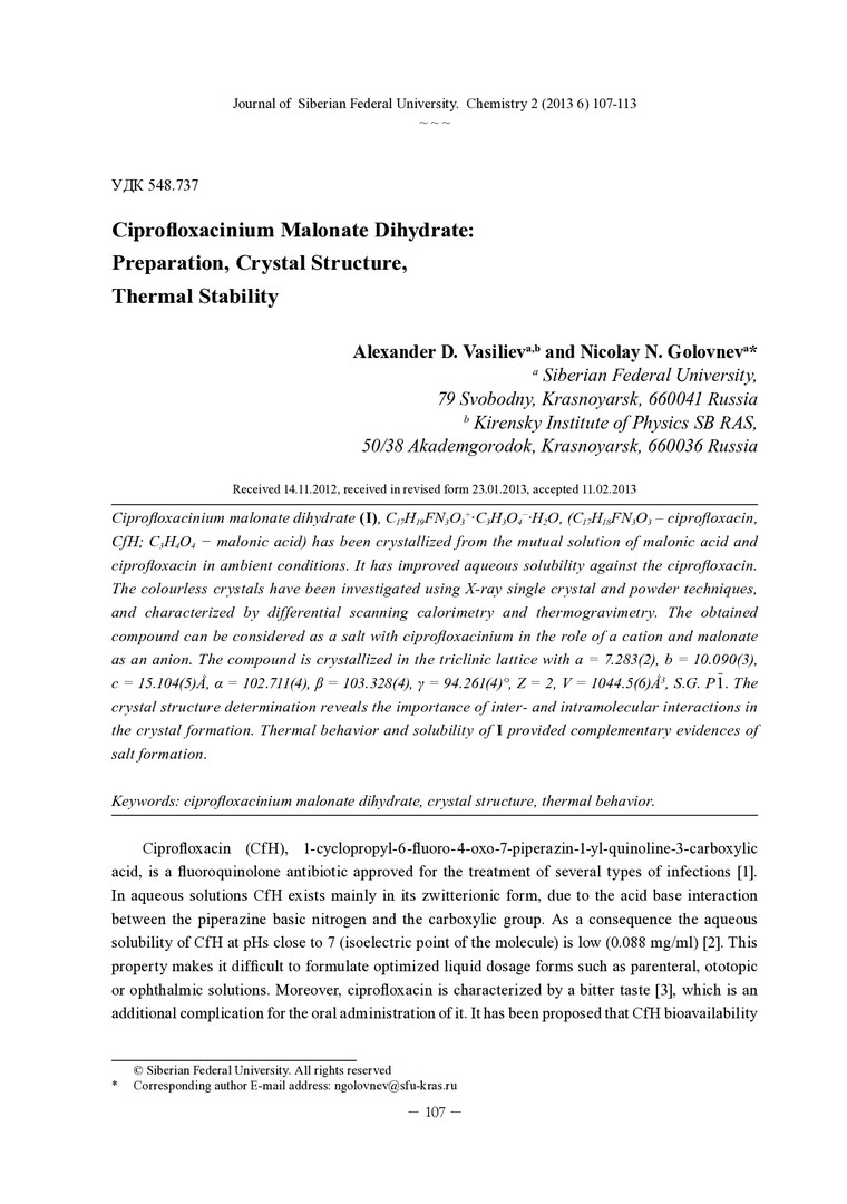 Библиографическое описание:Vasiliev, Alexander. Ciprofloxacinium Malonate Dihydrate: Preparation, Crystal Structure, Thermal Stability = Дигидрат малоната ципрофлоксациниума: приготовление, кристаллическая структура, термическая устойчивость / A. D. Vasiliev, N. N. Golovnev. - Текст : непосредственный // Журнал Сибирского федерального университета. Химия. - 2013. - Т. 6, № 2. - С. 107-113 : ил. - Библиогр.: с. 112-113 (12назв.). - ISSN 1998-2836.
