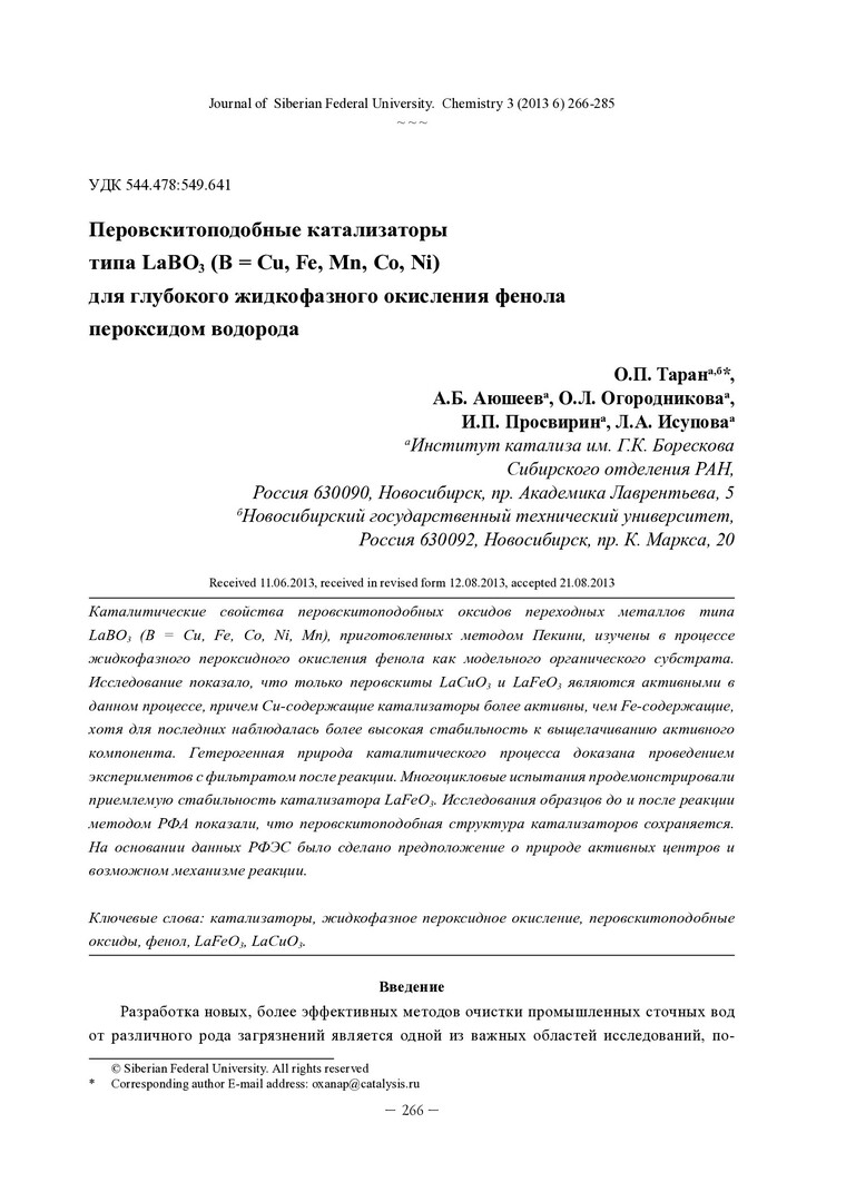 Библиографическое описание:Перовскитоподобные катализаторы типа LaBO[3] (B = Cu, Fe, Mn, Co, Ni) для глубокого жидкофазного окисления фенола пероксидом водорода = Perovskite-like catalysts LaBO[3] (B = Cu, Fe, Mn, Co, Ni) for wet peroxide oxidation of phenol / О. П. Таран [и др.]. - Текст : непосредственный // Журнал Сибирского федерального университета. Химия. - 2013. - Т. 6, № 3. - С. 266-285 : ил. - Библиогр.: с. 282-284 (45 назв.). - ISSN 1998-2836.