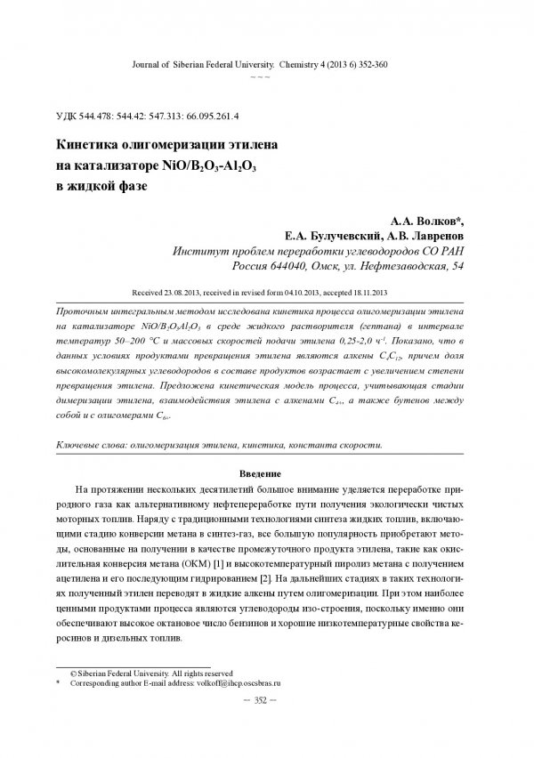 Библиографическое описание:Волков, А. А. Кинетика олигомеризации этилена на катализаторе NiO/B2O3-Al2O3 в жидкой фазе = Kinetics of Ethylene Oligomerization on NiO/B[2]O[3]-Al[2]O[3] / А. А. Волков, Е. А. Булучевский, А. В. Лавренов. - Текст : непосредственный // Журнал Сибирского федерального университета. Химия. - 2013. - Т. 6, № 4. - С. 352-360 : ил. - Библиогр.: с. 358-359 (13 назв.). - ISSN 1998-2836.