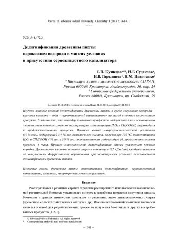 Аннотация:Изучено влияние условий делигнификации древесины пихты в среде «пероксид водорода – уксусная кислота – вода – сернокислотный катализатор» на выход и состав целлюлозного продукта.