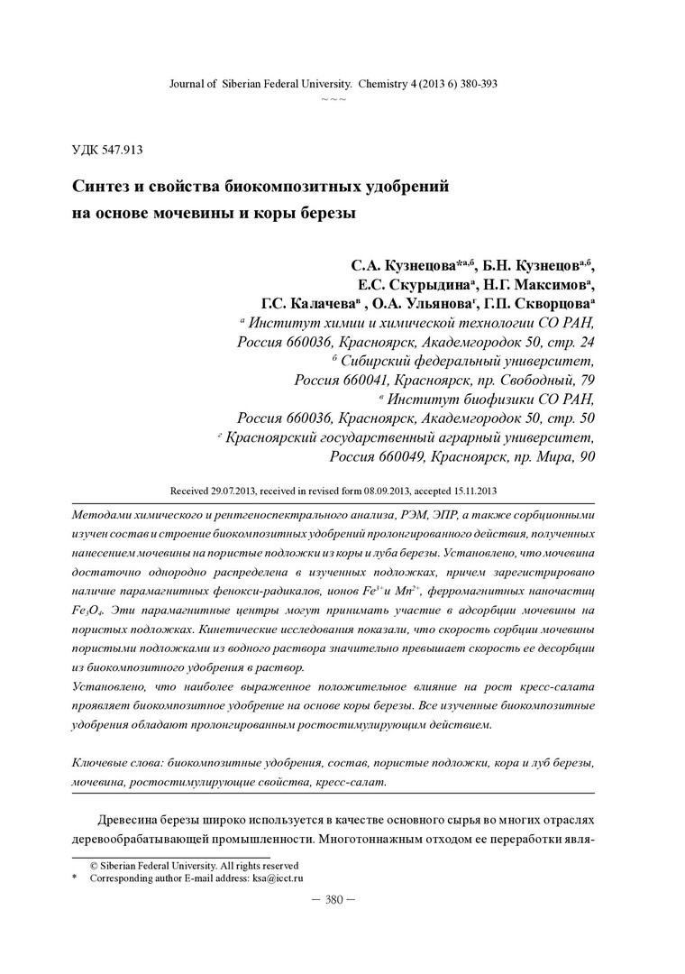 Аннотация:Методами химического и рентгеноспектрального анализа, РЭМ, ЭПР, а также сорбционными изучен состав и строение биокомпозитных удобрений пролонгированного действия, полученных нанесением мочевины на пористые подложки из коры и луба березы.