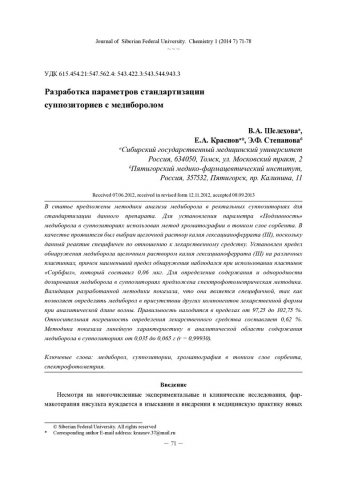 Библиографическое описание:Шелехова, В. А. Разработка параметров стандартизации суппозиториев с медиборолом = Development of Standardization Parameters of Suppositories with Mediborol / В. А. Шелехова, Е. А. Краснов, Э. Ф. Степанова. - Текст : непосредственный // Журнал Сибирского федерального университета. Химия. - 2014. - Т. 7, № 1. - С. 71-78 : ил., табл. - Библиогр.: с. 77 (7 назв.). - ISSN 1998-2836.
