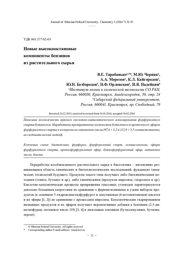 Библиографическое описание:Новые высокооктановые компоненты бензинов из растительного сырья = New Gasoline Components of High Octane Number Made of Plant Raw Materials / Тарабанько В. Е. [и др.]. - Текст : непосредственный // Журнал Сибирского федерального университета. Химия. - 2014. - Т. 7, № 1. - С. 31-35 : табл. - Библиогр.: с. 34 (10 назв.). - ISSN 1998-2836.