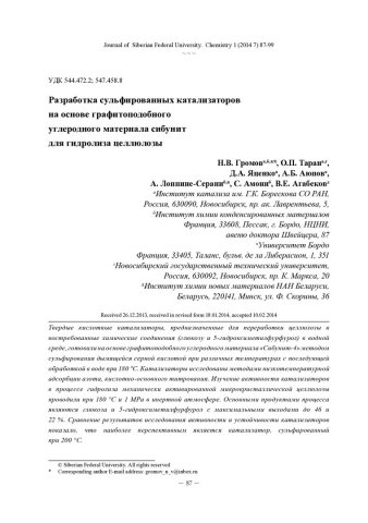 Библиографическое описание:Разработка сульфированных катализаторов на основе графитоподобного углеродного материала сибунит для гидролиза целлюлозы = Development of Sulfonated Catalysts Based on Graphite-Like Carbon Sibunit for Cellulose Hydrolysis / Н. В. Громов [и др.]. - Текст : непосредственный // Журнал Сибирского федерального университета. Химия. - 2014. - Т. 7, № 1. - С. 87-99 : ил., табл. - Библиогр.: с. 96-98 (38 назв.). - ISSN 1998-2836.