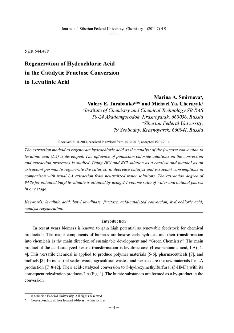 Библиографическое описание:Smirnova, Marina. Regeneration of Hydrochloric Acid in the Catalytic Fructose Conversion to Levulinic Acid = Регенерация солянокислотного катализатора конверсии фруктозы в левулиновую кислоту / M. A. Smirnova, V. E. Tarabanko, M. Yu. Chernyak. - Текст : непосредственный // Журнал Сибирского федерального университета. Химия. - 2014. - Т. 7, № 1. - С. 4-9 : ил. - Библиогр.: с. 7-8 (25 назв.). - ISSN 1998-2836.