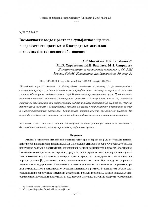 Аннотация:Исследован переход цветных и благородных металлов в раствор с фильтрационным смещением при прохождении водных и лигносульфонатных растворов через слой лежалых хвостов обогащения медно-никелевых руд Норильского промышленного узла.