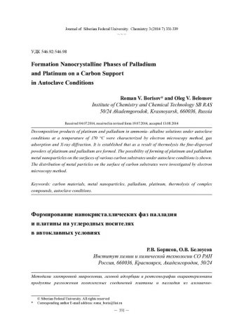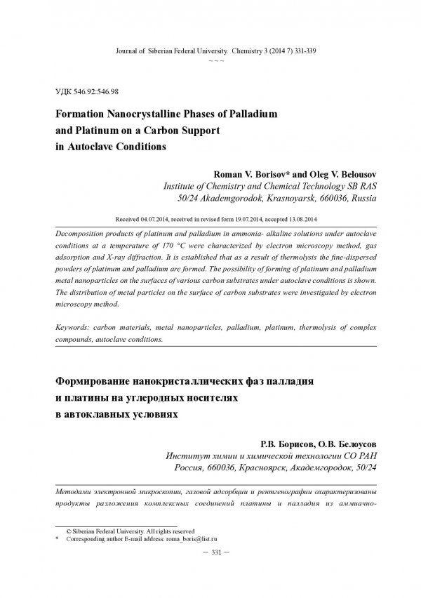 Библиографическое описание: Борисов, Р. В. Формирование нанокристаллических фаз палладия и платины на углеродных носителях в автоклавных условиях = Formation Nanocrystalline Phases of Palladium and Platinum on a Carbon Support in Autoclave Conditions / Р. В. Борисов, О. В. Белоусов. - Текст : непосредственный // Журнал Сибирского федерального университета. Химия. - 2014. - Т. 7, № 3. - С. 331-339 : ил. - Библиогр.: с. 338-339 (15 назв.). - ISSN 1998-2836.