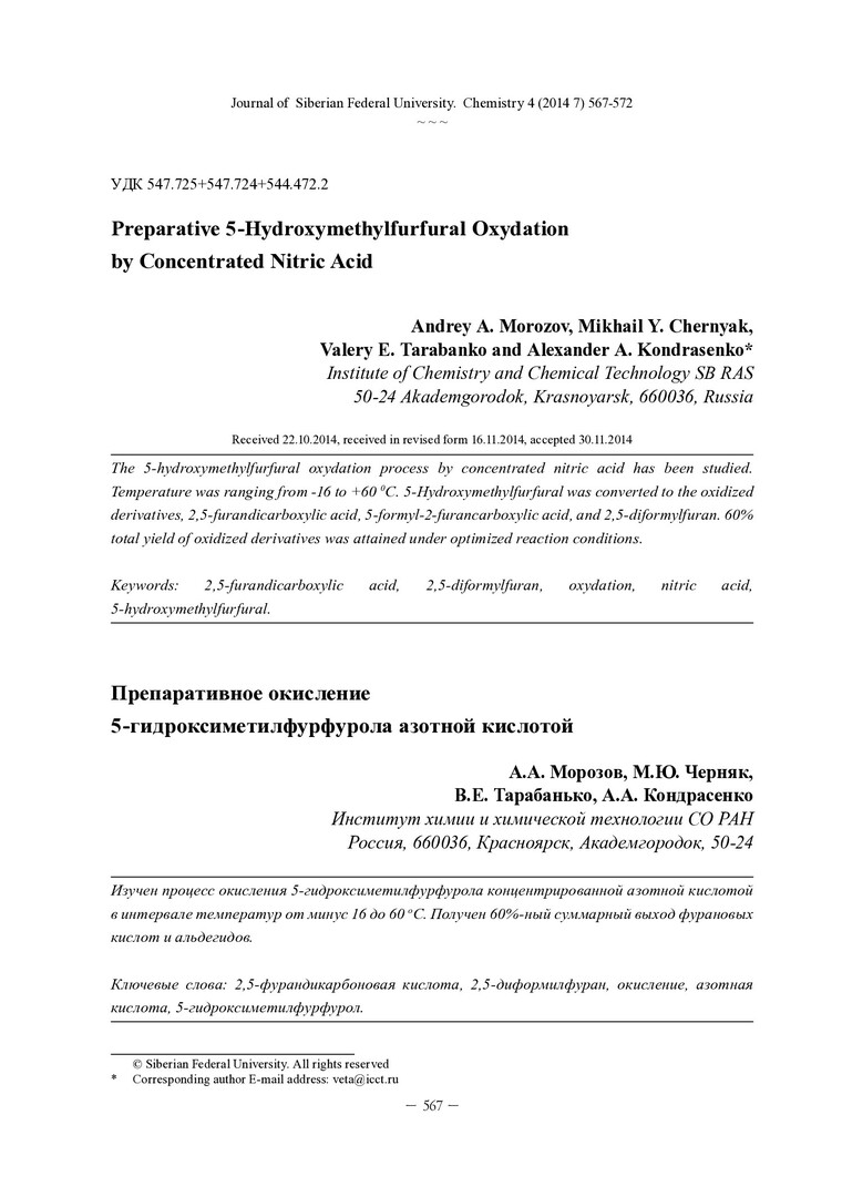 Библиографическое описание:Препаративное окисление 5-гидроксиметилфурфурола азотной кислотой = Preparative 5-Hydroxymethylfurfural Oxydation by Concentrated Nitric Acid / А. А. Морозов, М. Ю. Черняк, В. Е. Тарабанько, А. А. Кондрасенко. - Текст : непосредственный // Журнал Сибирского федерального университета. Химия. - 2014. - Т. 7, № 4. - С. 567-572. - Библиогр.: с. 571-572 (23 назв.). - ISSN 1998-2836.