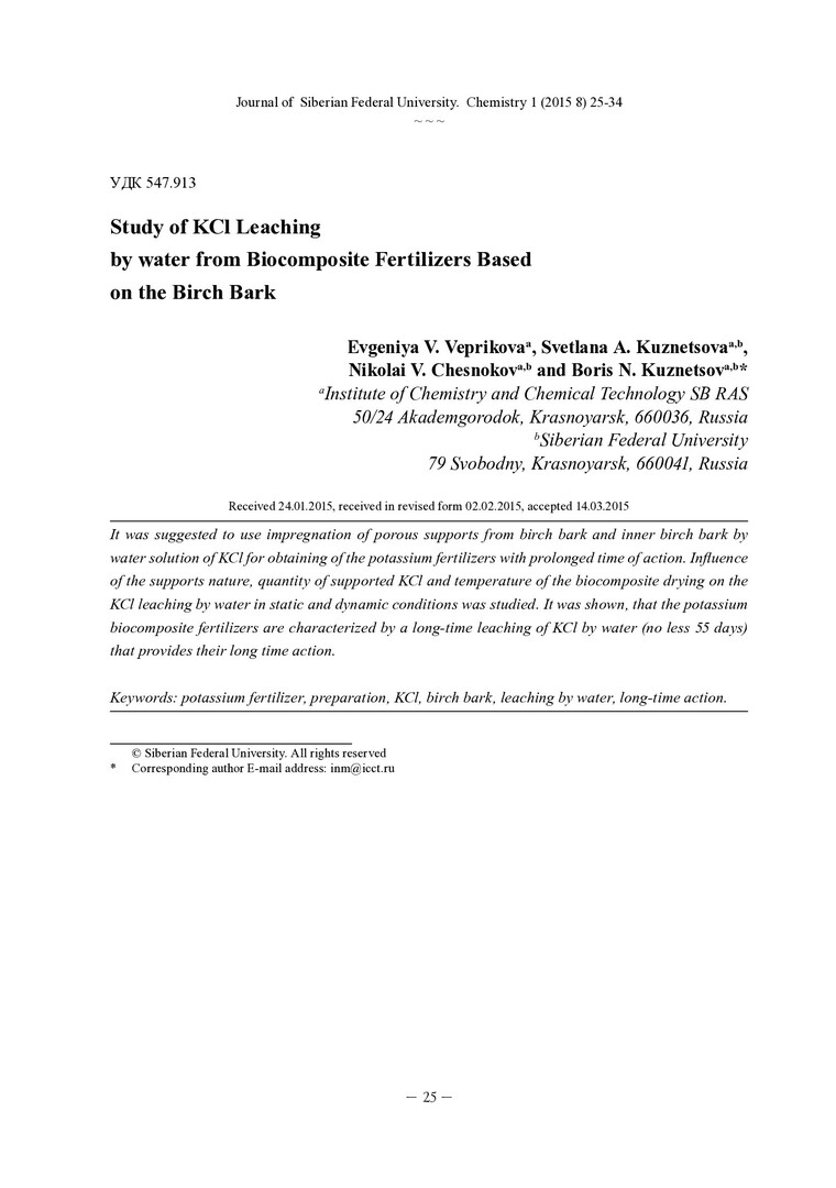 Библиографическое описание:Изучение вымывания KCl водой из биокомпозитных удобрений на основе коры березы = Study of KCl Leaching by water from Biocomposite Fertilizers Based / Е. В. Веприкова [и др.]. - Текст : непосредственный // Журнал Сибирского федерального университета. Химия. - 2015. - Т. 8, № 1. - С. 25-34 : ил. - Библиогр.: с. 32-34 (19 назв.). - ISSN 1998-2836.