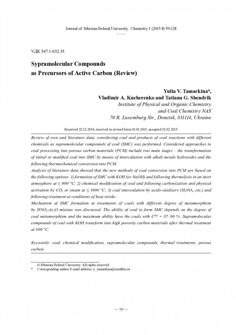 Библиографическое описание:Тамаркина, Ю. В. Супрамолекулярные соединения в качестве предшественников активных углей (обзор) = Sypramolecular Compounds as Precursors of Active Carbon (Review) / Ю. В. Тамаркина, В. А. Кучеренко, Т. Г. Шендрик. - Текст : непосредственный // Журнал Сибирского федерального университета. Химия. - 2015. - Т. 8, № 1. - С. 99-128 : ил. - Библиогр.: с. 125-128 (42 назв.). - ISSN 1998-2836.