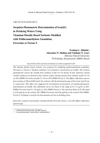 Библиографическое описание:Дидух, С. Л. Определение содержания железа(II) в питьевых водах сорбционно-фотометрическим методом с использованием сорбентов на основе диоксида титана, последовательно модифицированного полигексаметиленгуанидином, Ferrozine и Ferene S = Sorption-Photometric Determination of Iron(II) in Drinking Waters Using / С. Л. Дидух, А. Н. Мухина, В. Н. Лосев. - Текст : непосредственный // Журнал Сибирского федерального университета. Химия. - 2015. - Т. 8, № 1. - С. 35-44 : ил. - Библиогр.: с. 43-44 (20 назв.). - ISSN 1998-2836.