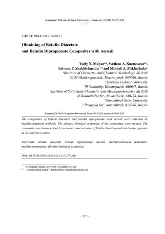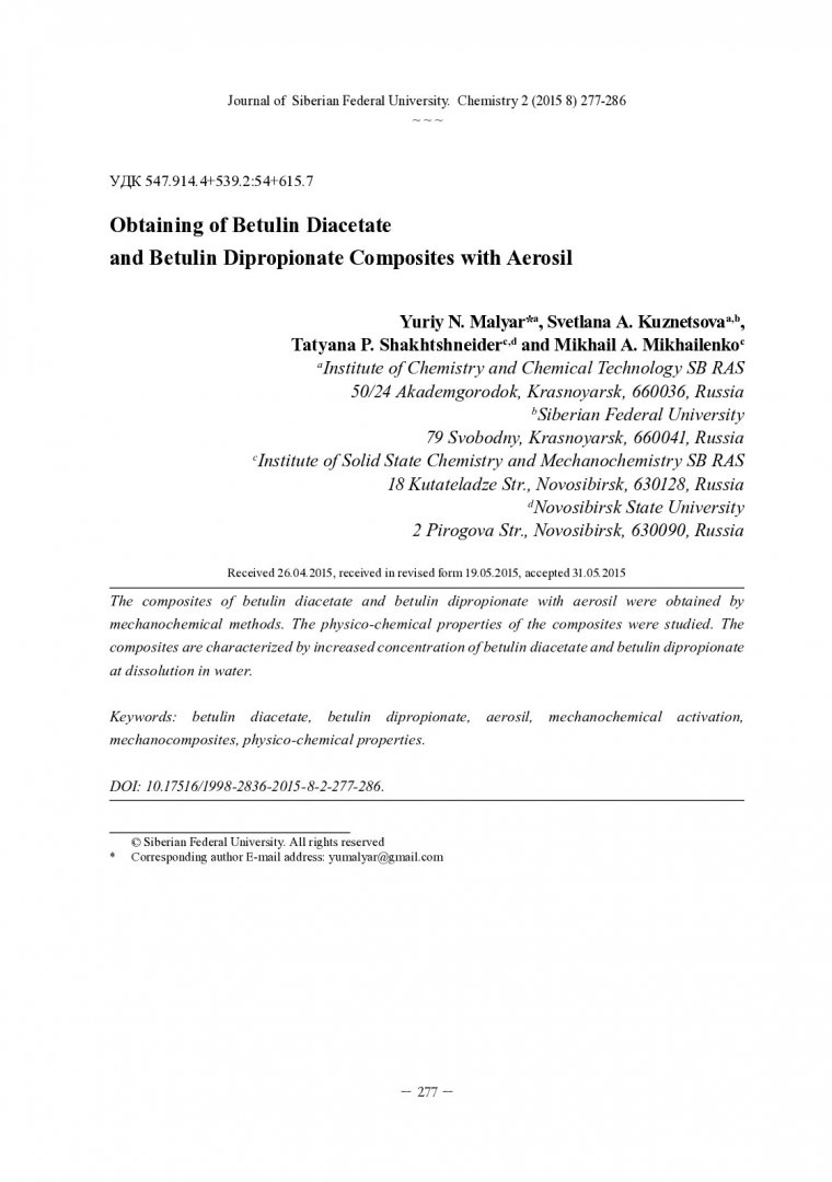 Библиографическое описание:Получение композитов диацетата и дипропионата бетулина с аэросилом = Obtaining of Betulin Diacetate and Betulin Dipropionate Composites with Aerosil / Ю. Н. Маляр [и др.]. - Текст : непосредственный // Журнал Сибирского федерального университета. Химия. - 2015. - Т. 8, № 2. - С. 277-286 : ил. - Библиогр.: с. 285-286 (15 назв.). - ISSN 1998-2836.