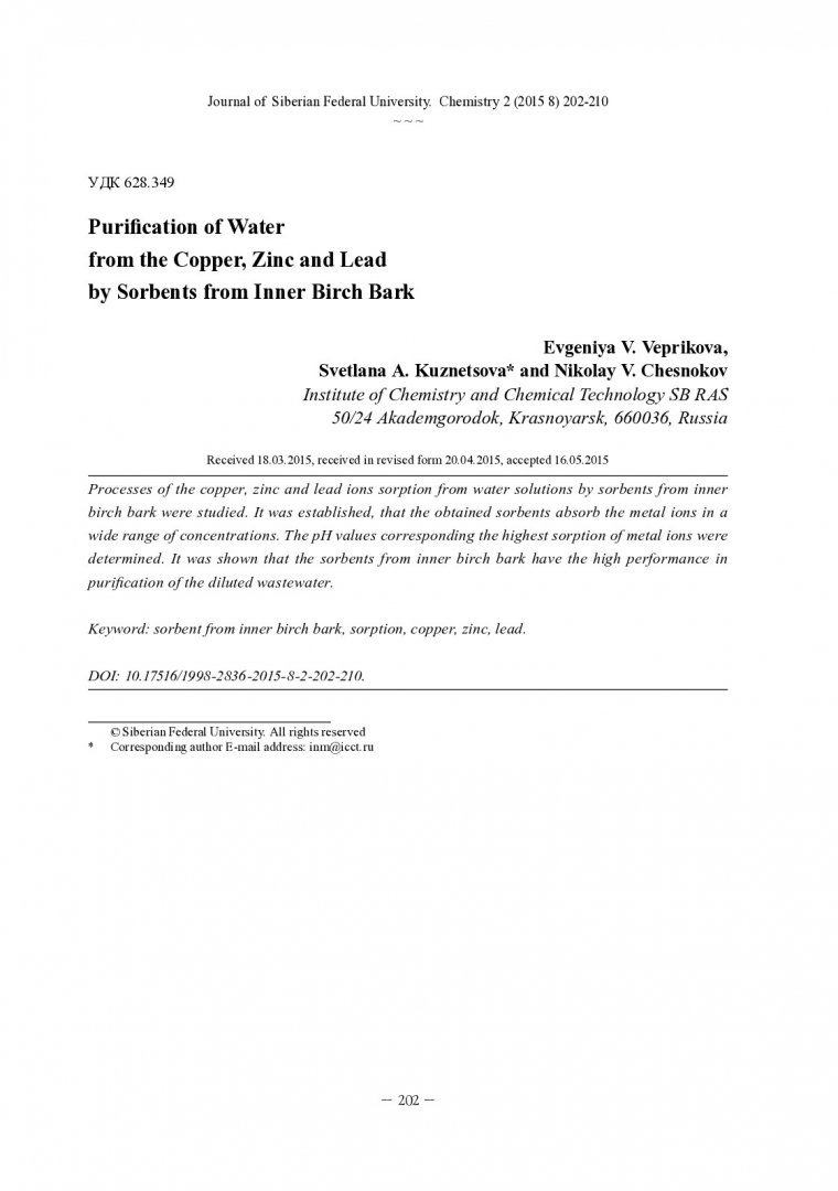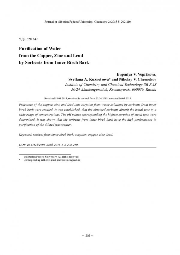 Библиографическое описание:Веприкова, Е. В. Очистка воды от меди, цинка и свинца сорбентами из луба коры березы = Purification of Water from the Copper, Zinc and Lead by Sorbents from Inner Birch Bark / Е. В. Веприкова, С. А. Кузнецова, Н. В. Чесноков. - Текст : непосредственный // Журнал Сибирского федерального университета. Химия. - 2015. - Т. 8, № 2. - С. 202-210 : ил. - Библиогр.: с. 208-210 (12 назв.). - ISSN 1998-2836.