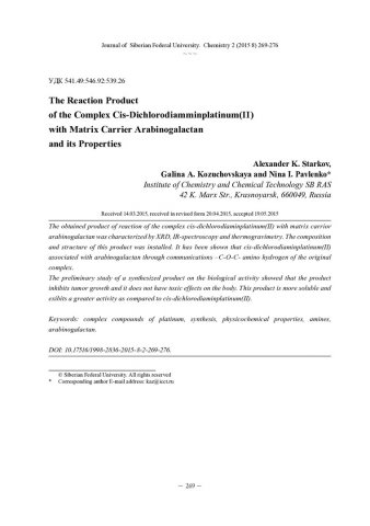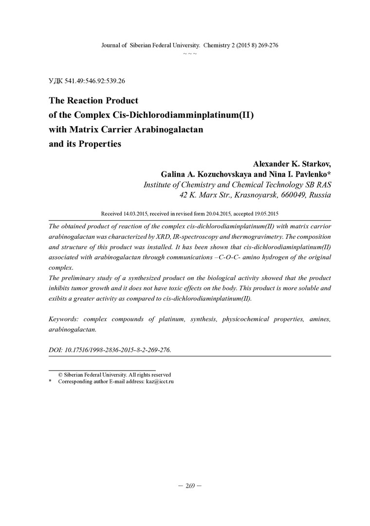Библиографическое описание:Старков, А. К. Продукт взаимодействия комплекса цис-дихлородиамминплатины (II) с матрицей-носителем арабинога-лактаном и его свойства = The Reaction Product of the Complex Cis- Dichlorodiamminplatinum (II) with Matrix Carrier Arabinogalactan and its Properties / А. К. Старков, Г. А. Кожуховская, Н. И. Павленко. - Текст : непосредственный // Журнал Сибирского федерального университета. Химия. - 2015. - Т. 8, № 2. - С. 269-276 : ил. - Библиогр.: с. 275-276 (26 назв.). - ISSN 1998-2836.