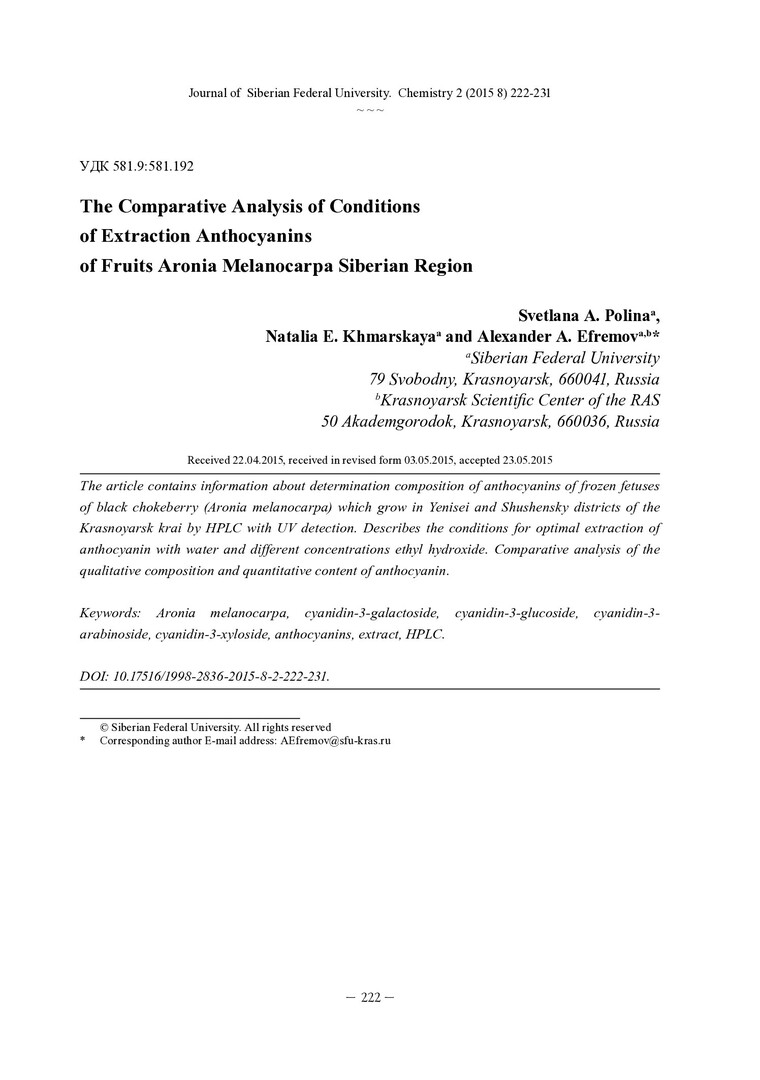 Библиографическое описание:Полина, С. А. Сравнительный анализ условий экстракционного извлечения антоцианов Aronia Melanocarpa Сибирского региона = The Comparative Analysis of Conditions of Extraction Anthocyanins of Fruits Aronia Melanocarpa Siberian Region / С. А. Полина, Н. Е. Хмарская, А. А. Ефремов. - Текст : непосредственный // Журнал Сибирского федерального университета. Химия. - 2015. - Т. 8, № 2. - С. 222-231 : ил. - Библиогр.: с. 229-231 (18 назв.). - ISSN 1998-2836.