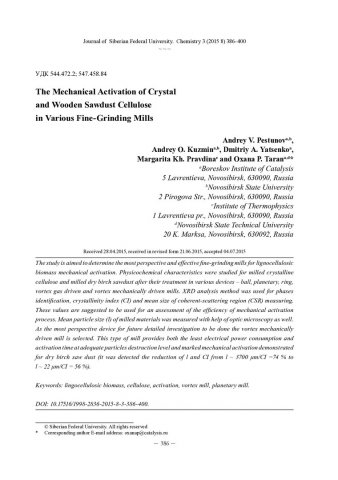Библиографическое описание:Механическая активация чистой и содержащейся в древесных опилках целлюлозы в мельницах различного типа = The Mechanical Activation of Crystal and Wooden Sawdust Cellulose in Various Fine-Grinding Mills / А. В. Пестунов [и др.]. - Текст : непосредственный // Журнал Сибирского федерального университета. Химия. - 2015. - Т. 8, № 3. - С. 386-400 : ил. - Библиогр.: с. 398-400 (27 назв.). - ISSN 1998-2836.