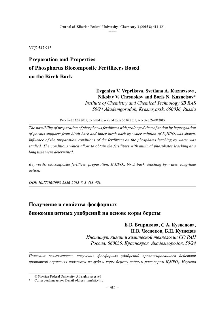 Библиографическое описание:Получение и свойства фосфорных биокомпозитных удобрений на основе коры березы = Preparation and Properties of Phosphorus Biocomposite Fertilizers Based on the Birch Bark / Е. В. Веприкова [и др.]. - Текст : непосредственный // Журнал Сибирского федерального университета. Химия. - 2015. - Т. 8, № 3. - С. 413-421 : ил. - Библиогр.: с. 420-421 (11 назв.). - ISSN 1998-2836.