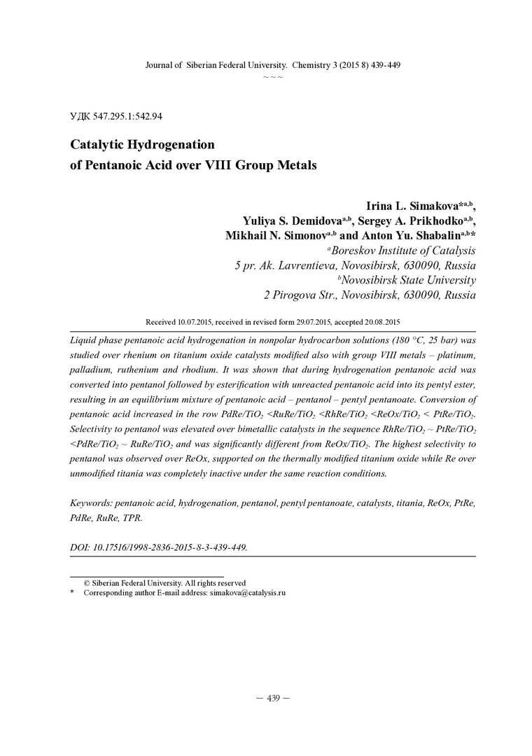 Библиографическое описание:Каталитическое гидрирование пентановой кислоты на металлах VIII группы = Catalytic Hydrogenation of Pentanoic Acid over VIII Group Metals / И. Л. Симакова [и др.]. - Текст : непосредственный // Журнал Сибирского федерального университета. Химия. - 2015. - Т. 8, № 3. - С. 439-449 : ил. - Библиогр.: с. 448-449 (11 назв.). - ISSN 1998-2836.
