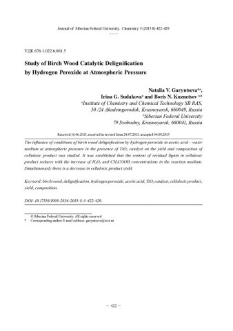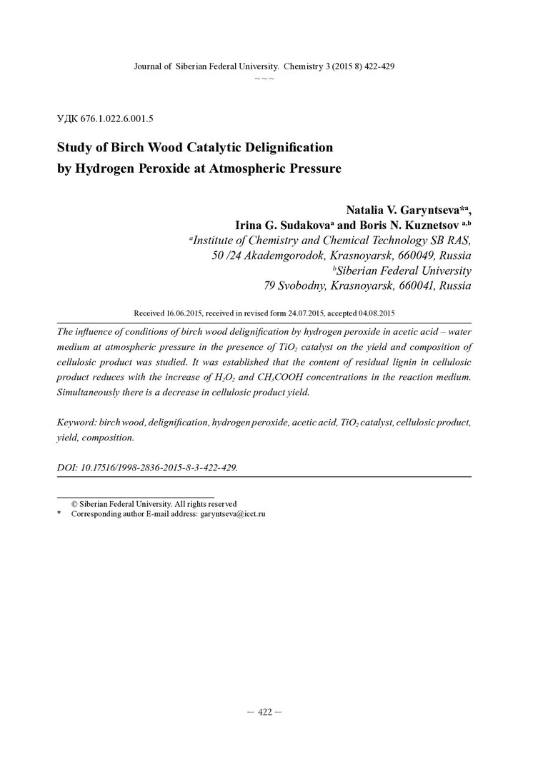 Библиографическое описание:Гарынцева, Н. В. Изучение каталитической делигнификации древесины березы пероксидом водорода при атмосферном давлении = Study of Birch Wood Catalytic Deligni? cation by Hydrogen Peroxide at Atmospheric Pressure / Н. В. Гарынцева, И. Г. Судакова, Б. Н. Кузнецов. - Текст : непосредственный // Журнал Сибирского федерального университета. Химия. - 2015. - Т. 8, № 3. - С. 422-429 : ил. - Библиогр.: с. 428-429 (16 назв.). - ISSN 1998-2836.