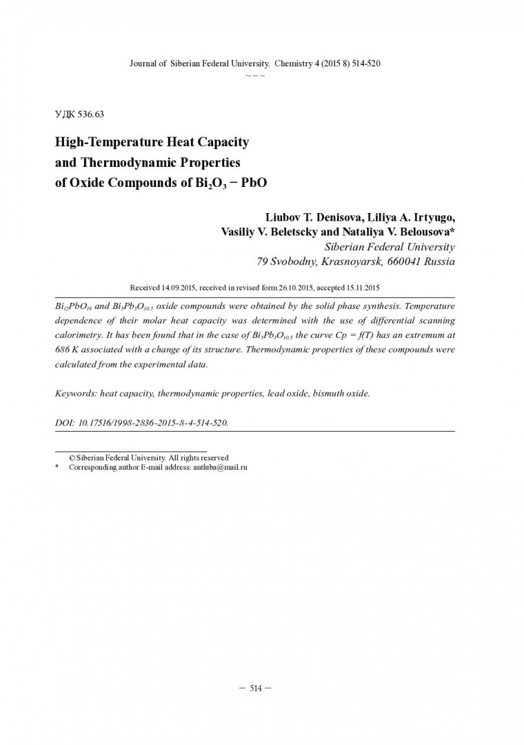 Библиографическое описание:Теплоемкость и термодинамические свойства оксидных соединений системы Bi[2]O[3] ? PbO = High-Temperature Heat Capacity and Thermodynamic Properties of Oxide Compounds of Bi[2]O[3] - PbO / Л. Т. Денисова [и др.]. - Текст : непосредственный // Журнал Сибирского федерального университета. Химия. - 2015. - Т. 8, № 4. - С. 514-520 : ил. - Библиогр.: с. 519-520 (21 назв.). - ISSN 1998-2836.