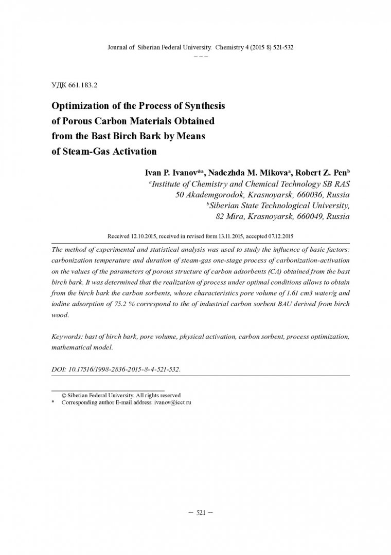 Библиографическое описание:Иванов, И. П. Оптимизация процесса синтеза пористых углеродных материалов, получаемых из луба коры березы методом парогазовой активации = Optimization of the Process of Synthesis of Porous Carbon Materials Obtained from the Bast Birch Bark by Means of Steam-Gas Activation / И. П. Иванов, Н. М. Микова, Р. З. Пен. - Текст : непосредственный // Журнал Сибирского федерального университета. Химия. - 2015. - Т. 8, № 4. - С. 521-532 : ил. - Библиогр.: с. 531-532 (11 назв.). - ISSN 1998-2836.