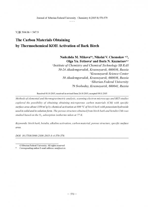 Аннотация:Методами элементного и термогравиметрического анализов, сканирующей электронной микроскопии и БЭТ-исследованиями изучена возможность получения микропористых углеродных материалов (УМ) с удельной поверхностью около 1350 м2/г из бересты березы методом щелочного активирования при 800 градусов C гидроксидом калия, используемым в твердом виде и в форме раствора.