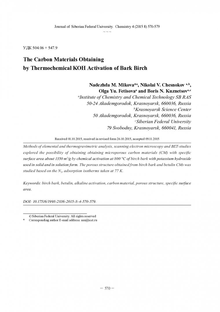 Библиографическое описание:Получение углеродных адсорбентов из бересты березы методом термохимической активации КОН = The Carbon Materials Obtaining by Thermochemical KOH Activation of Bark Birch / Н. М. Микова. - Текст : непосредственный // Журнал Сибирского федерального университета. Химия. - 2015. - Т. 8, № 4. - С. 570-579 : ил. - Библиогр.: с. 578-579 (9 назв.). - ISSN 1998-2836.